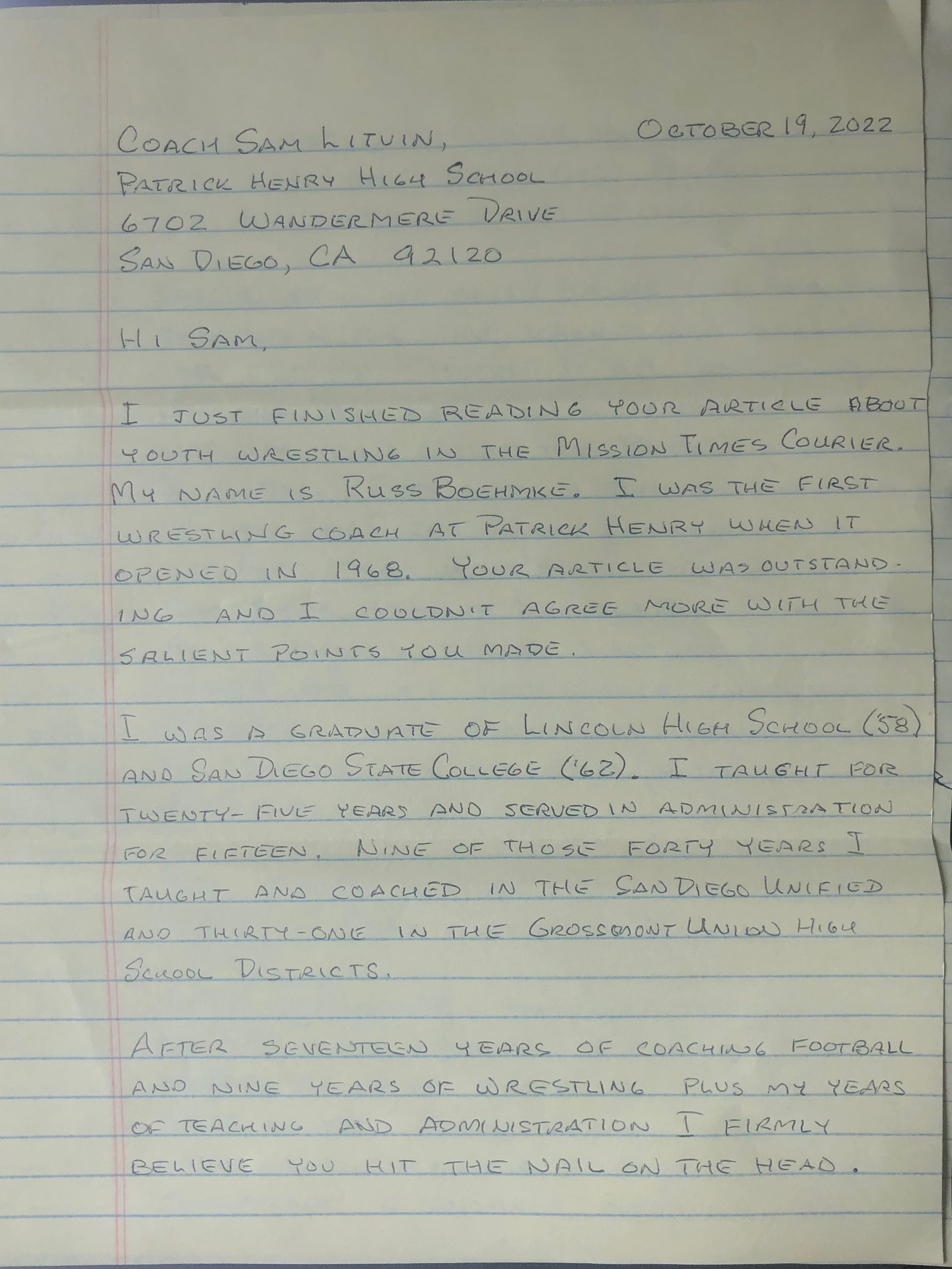 Coach Russ was the first coach at Patrick Henry. He didn’t wrestle much, but he left an indelible mark on the program. Thanks to him, we are here today. Not too long I found a lost letter from him to me, I wanted to share it with community as his message is very clear: if you want kids to succeed, get them involved in something bigger than themselves.