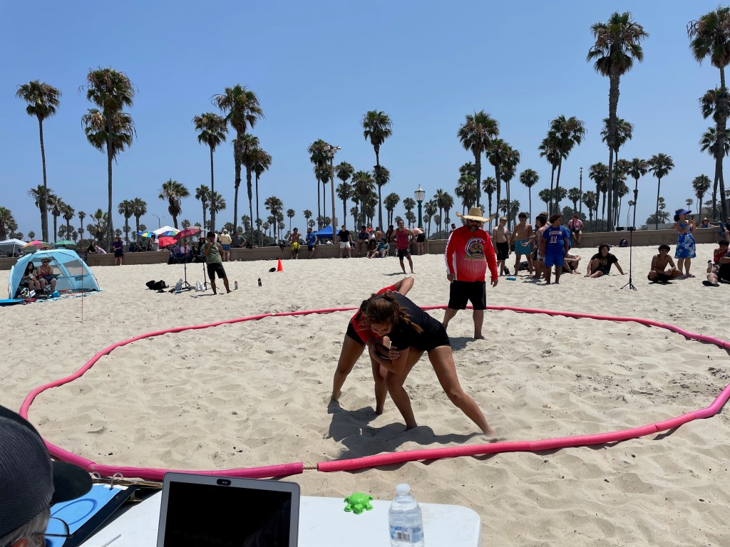 Beach Wrestling is one of the newest of the hundreds of wrestling styles. It was first sanctioned in 2008 and has been growing in popularity. SD Champ Camp has been partnering with Palomar Wrestling. Palomar College team is coached by Timmy Box who is the first American world medalist in Beach Wrestling and also the head coach of the US Team. He had just returned from Romania where the US Team had their best showing with multiple placers.